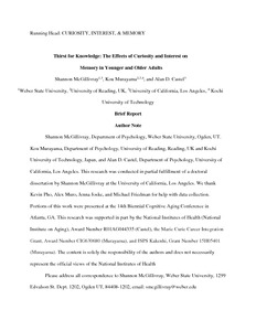 McGillivray, S., Murayama, K. and Castel, A. D. (2015) Thirst for knowledge: the effects of curiosity and interest on memory in younger and older adults. Psychology and Aging, 30 (4). pp. 835-841. ISSN 0882-7974 doi: 10.1037/a0039801