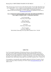 Vereenooghe, L., Reynolds, S., Gega, L. and Langdon, P. E. (2015) Can a computerised training paradigm assist people with intellectual disabilities to learn cognitive mediation skills? A randomised experiment. Behaviour Research and Therapy, 71. pp. 10-19. ISSN 0005-7967 doi: 10.1016/j.brat.2015.05.007