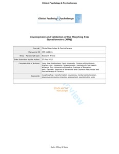Zysk, E., Shafran, R., Williams, T. I. ORCID: https://orcid.org/0000-0003-0072-3316 and Melli, G. (2016) Development and validation of the Morphing Fear Questionnaire (MFQ). Clinical Psychology & Psychotherapy, 23 (6). pp. 533-542. ISSN 1063-3995 doi: 10.1002/cpp.1987