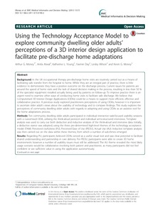 Money, A. G., Atwal, A., Young, K. L., Day, Y., Wilson, L. and Money, K. G. (2015) Using the Technology Acceptance Model to explore community dwelling older adults’ perceptions of a 3D interior design application to facilitate pre-discharge home adaptations. BMC Medical Informatics and Decision Making, 15 (1). 73. ISSN 1472-6947 doi: 10.1186/s12911-015-0190-2
