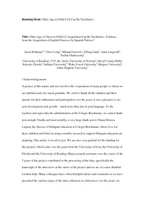 Rothman, J., Long, D., Iverson, M., Judy, T., Lingwall, A. and Chakravarty, T. (2016) Older age of onset in child L2 acquisition can be facilitative: evidence from the acquisition of English passives by Spanish natives. Journal of Child Language, 43 (3). pp. 662-686. ISSN 0305-0009 doi: 10.1017/S0305000915000549