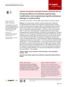 This study examines whether combined cognitive bias modification for interpretative biases (CBM-I) and computerised cognitive behaviour therapy (C-CBT) can produce enhanced positive effects on interpretation biases and social anxiety. Forty socially anxious students were randomly assigned into two conditions, an intervention group (positive CBM-I + C-CBT) or an active control (neutral CBM-I + C-CBT). At pre-test, participants completed measures of social anxiety, interpretative bias, cognitive distortions, and social and work adjustment. They were exposed to 6 × 30 min sessions of web-based interventions including three sessions of either positive or neutral CBM-I and three sessions of C-CBT, one session per day. At post-test and two-week follow-up, participants completed the baseline measures. A combined positive CBM-I + C-CBT produced less negative interpretations of ambiguous situations than neutral CBM-I + C-CBT. The results also showed that both positive CBM-I + C-CBT and neutral CBM-I + C-CBT reduced social anxiety and cognitive distortions as well as improving work and social adjustment. However, greater effect sizes were observed in the positive CBM-I + C-CBT condition than the control. This indicates that adding positive CBM-I to C-CBT enhanced the training effects on social anxiety, cognitive distortions, and social and work adjustment compared to the neutral CBM-I + C-CBT condition.