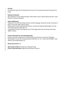 A comparative study of the characteristics of French Fries produced by deep fat frying and air frying.