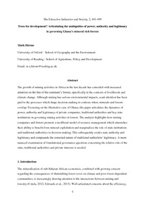 The growth of mining activities in Africa in the last decade has coincided with increased attention on the fate of the continent’s forests, specifically in the contexts of livelihoods and climate change. Although mining has serious environmental impacts, scant attention has been paid to the processes which shape decision-making in contexts where minerals and forests overlap. Focussing on the illustrative case of Ghana, this paper articulates the dynamics of power, authority and legitimacy of private companies, traditional authorities and key state institutions in governing mining activities in forests. The analysis highlights how mining companies and donors promote a neoliberal model of resource management which entrenches their ability to benefit from mineral exploitation and marginalises the role of state institutions and traditional authorities in decision-making. This subsequently erodes state authority and legitimacy and compounds the contested nature of traditional authorities’ legitimacy. A more nuanced examination of foundational governance questions concerning the relative role of the state, traditional authorities and private interests is needed.