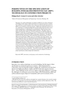 Innovative, low carbon technologies are already available for use in the construction of buildings, but the impact of their specification on construction projects is unclear. This exploratory research identifies issues which arise following the specification of BIPV in non-residential construction projects. Rather than treating the inclusion of a new technology as a technical problem, the research explores the issue from a socio-technical perspective to understand the accommodations which the project team makes and their effect on the building and the technology. The paper is part of a larger research project which uses a Social Construction of Technology Approach (SCOT) to explore the accommodations made to working practices and design when Building Integrated PhotoVoltaic (BIPV) technology is introduced. The approach explores how the requirements of the technology from different groups of actors (Relevant Social Groups or RSG's) give rise to problems and create solutions. As such it rejects the notion of a rational linear view of innovation diffusion; instead it suggests that the variety and composition of the Relevant Social Groups set the agenda for problem solving and solutions as the project progresses. The research explores the experiences of three people who have extensive histories of involvement with BIPV in construction, looks at how SCOT can inform our understanding of the issues involved and identifies themes and issues in the specification of BIPV on construction projects. A key finding concerns the alignment of inflection points at which interviewees have found themselves changing from one RSG to another as new problems and solutions are identified. The points at which they change RSG often occurred at points which mirror conventional construction categories (in terms of project specification, tender, design and construction).