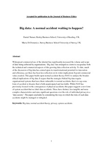 Widespread commercial use of the internet has significantly increased the volume and scope of data being collected by organisations. ‘Big data’ has emerged as a term to encapsulate both the technical and commercial aspects of this growing data collection activity. To date, much of the discussion of big data has centred upon its transformational potential for innovation and efficiency, yet there has been less reflection on its wider implications beyond commercial value creation. This paper builds upon normal accident theory (NAT) to analyse the broader ethical implications of big data. It argues that the strategies behind big data require organisational systems that leave them vulnerable to normal accidents, that is to say some form of accident or disaster that is both unanticipated and inevitable. Whilst NAT has previously focused on the consequences of physical accidents, this paper suggests a new form of system accident that we label data accidents. These have distinct, less tangible and more complex characteristics and raise significant questions over the role of individual privacy in a ‘data society’. The paper concludes by considering the ways in which the risks of such data accidents might be managed or mitigated.