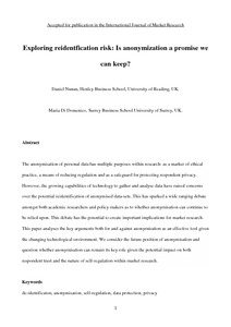 Nunan, D. and Di Domenico, M. (2015) Exploring reidentfication risk: is anonymization a promise we can keep? International Journal of Market Research, 58 (1). pp. 19-34. ISSN 1470-7853