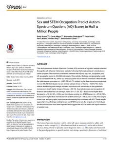 Ruzich, E., Allison, C., Chakrabarti, B. ORCID: https://orcid.org/0000-0002-6649-7895, Smith, P., Musto, H., Ring, H. and Baron-Cohen, S. (2015) Sex and STEM occupation predict Autism-spectrum Quotient (AQ) scores in half a million people. PLoS ONE, 10 (10). e0141229. ISSN 1932-6203 doi: 10.1371/journal.pone.0141229