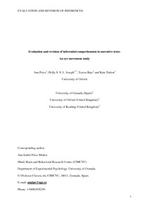 Perez, A., Joseph, H. S. S. L. ORCID: https://orcid.org/0000-0003-4325-4628, Bajo, T. and Nation, K. (2016) Evaluation and revision of inferential comprehension in narrative texts: an eye movement study. Language, Cognition and Neuroscience, 31 (4). pp. 549-566. ISSN 2327-3801 doi: 10.1080/23273798.2015.1115883