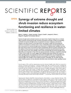 Caldeira, M. C., Lecomte, X., David, T. S., Pinto, J. G., Bugalho, M. N. and Werner, C. (2015) Synergy of extreme drought and shrub invasion reduce ecosystem functioning and resilience in water-limited climates. Scientific Reports, 5. 15110. ISSN 2045-2322 doi: 10.1038/srep15110