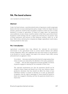 Under the bond scheme, a pre-determined series of payments would compensate farmers for lost revenues resulting from policy change. Unlike the Single Payment Scheme, payments would be fully decoupled: recipients would not have to retain farmland, or remain in agriculture. If vested in a paper asset, the guaranteed, unencumbered, income stream would be similar to that from a government bond. Recipients could exchange this for a capital sum reflecting the net present value of future payments, and reinvest in other business ventures, either on- or offfarm.With a finite, declining flow of payments, budget expenditure would reduce, releasing funds for other uses.