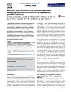 Our review looks at pollinator conservation and highlights the differences in approach between managing for pollination services and preserving pollinator diversity. We argue that ecosystem service management does not equal biodiversity conservation, and that maintaining species diversity is crucial in providing ecosystem resilience in the face of future environmental change. Management and policy measures therefore need to focus on species not just in human dominated landscapes but need to benefit wider diversity of species including those in specialised habitats. We argue that only by adopting a holistic ecosystem approach we can ensure the conservation and sustainable use of biodiversity and ecosystem services in the long-term.