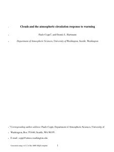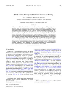 Ceppi, P. and Hartmann, D. L. (2016) Clouds and the atmospheric circulation response to warming. Journal of Climate, 29 (2). pp. 783-799. ISSN 1520-0442 doi: 10.1175/JCLI-D-15-0394.1
