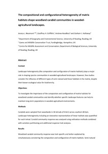 Landscape heterogeneity (the composition and configuration of matrix habitats) plays a major role in shaping species communities in wooded-agricultural landscapes. However, few studies consider the influence of different types of semi-natural and linear habitats in the matrix, despite their known ecological value for biodiversity. Objective To investigate the importance of the composition and configuration of matrix habitats for woodland carabid communities and identify whether specific landscape features can help to maintain long-term populations in wooded-agricultural environments. Methods Carabids were sampled from woodlands in 36 tetrads of 4 km2 across southern Britain. Landscape heterogeneity including an innovative representation of linear habitats was quantified for each tetrad. Carabid community response was analysed using ordination methods combined with variation partitioning and additional response trait analyses. Results Woodland carabid community response was trait-specific and better explained by simultaneously considering the composition and configuration of matrix habitats. Semi-natural and linear features provided significant refuge habitat and functional connectivity. Mature hedgerows were essential for slow-dispersing carabids in fragmented landscapes. Species commonly associated with heathland were correlated with inland water and woodland patches despite widespread heathland conversion to agricultural land, suggesting that species may persist for some decades when elements representative of the original habitat are retained following landscape modification. Conclusions Semi-natural and linear habitats have high biodiversity value. Landowners should identify features that can provide additional resources or functional connectivity for species relative to other habitat types in the landscape matrix. Agri-environment options should consider landscape heterogeneity to identify the most efficacious changes for biodiversity.