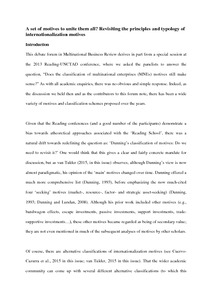 Purpose – The purpose of this paper is to introduce the debate forum on internationalization motives of this special issue of Multinational Business Review. Design/methodology/approach – The authors reflect on the background and evolution of the internationalization motives over the past few decades, and then provide suggestions for how to use the motives for future analyses. The authors also reflect on the contributions to the debate of the accompanying articles of the forum. Findings – There continue to be new developments in the way in which firms organize themselves as multinational enterprises (MNEs), and this implies that the “classic” motives originally introduced by Dunning in 1993 need to be revisited. Dunning’s motives and arguments were deductive and atheoretical, and these were intended to be used as a toolkit, used in conjunction with other theories and frameworks. They are not an alternative to a classification of possible MNE strategies. Originality/value – This paper and the ones that accompany it, provide a deeper and nuanced understanding on internationalization motives for future research to build on.