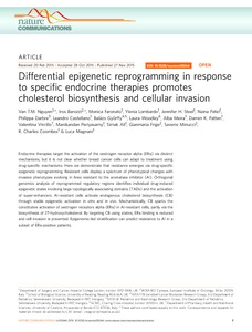 Nguyen, V. T.M., Barozzi, I., Faronata, M., Lombardo, Y., Steel, J. H., Patel, N., Darbre, P., Castellano, L., Gyorffy, B., Woodley, L., Rodriguez-Meira, A., Patten, D. K., Vircillo, V., Periyasamy, M., Ali, S., Frige, G., Minucci, S., Coombes, R. C. and Magnani, L. (2015) Differential epigenetic reprogramming in response to specific endocrine therapies promotes cholesterol biosynthesis and cellular invasion. Nature Communications, 6. 10044. ISSN 2041-1723 doi: 10.1038/ncomms10044
