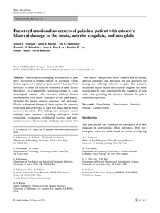 Feinstein, J. S., Khalsa, S. S., Salomons, T. V., Prkachin, K. M., Frey-Law, L. A., Lee, J. E., Tranel, D. and Rudrauf, D. (2016) Preserved emotional awareness of pain in a patient with extensive bilateral damage to the insula, anterior cingulate, and amygdala. Brain Structure and Function, 221 (3). pp. 1499-1511. ISSN 1863-2661 doi: 10.1007/s00429-014-0986-3