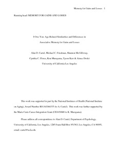 Castel, A. D., Friedman, M. C., McGillivray, S., Flores, C. C., Murayama, K., Kerr, T. and Drolet, A. (2016) I owe you: age-related similarities and differences in associative memory for gains and losses. Aging, Neuropsychology and Cognition, 23 (5). pp. 549-565. ISSN 1744-4128 doi: 10.1080/13825585.2015.1130214