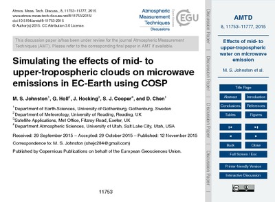 Johnston, M. S., Holl, G., Hocking, J., Cooper, S. J. and Chen, D. (2015) Simulating the effects of mid- to upper-tropospheric clouds on microwave emissions in EC-Earth using COSP. Atmospheric Measurement Techniques Discussions, 8 (11). pp. 11753-11777. ISSN 1867-8610 doi: 10.5194/amtd-8-11753-2015