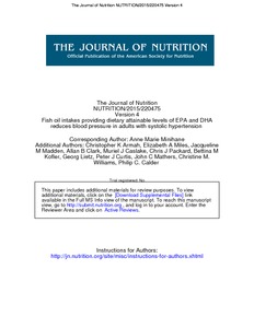 Minihane, A. M., Armah, C. K., Miles, E. A., Madden, J. M., Clark, A. B., Caslake, M. J., Packard, C. J., Kofler, B. M., Leitz, G., Curtis, P. J., Mathers, J. C., Williams, C. M. and Calder, P. C. (2016) Consumption of fish oil providing amounts of eicosapentaenoic acid and docosahexaenoic acid that can be obtained from the diet reduces blood pressure in adults with systolic hypertension: a retrospective analysis. Journal of Nutrition, 146 (3). pp. 516-523. ISSN 1541-6100 doi: 10.3945/jn.115.220475