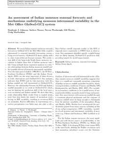 An assessment of Indian monsoon seasonal forecasts and mechanisms underlying monsoon interannual variability in the Met Office GloSea5-GC2 system.