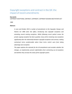 In June and October 2014 a number of amendments to the Copyright, Designs and Patents Act 1988 came into effect, introducing new copyright exceptions and amending several existing exceptions. Whilst following recent judicial review the private copying exception has been quashed, many of the remaining new exceptions significantly alter the relationship between copyright exceptions and contract, making contractual terms unenforceable where those terms restrict users from taking advantage of an exception. This paper explores the rationale for the UK amendments and considers whether the changes, as implemented, prevent rightsholders from contracting out of exceptions and whether they increase the clarity of the copyright system.