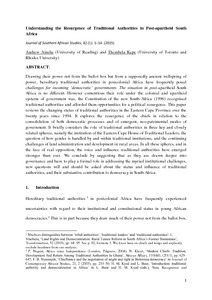 Drawing their power not from the ballot box but from a supposedly ancient wellspring of power, hereditary traditional authorities in postcolonial Africa have frequently posed challenges for incoming ‘democratic’ governments. The situation in post-apartheid South Africa is no different. However contentious their role under the colonial and apartheid systems of government was, the Constitution of the new South Africa (1996) recognised traditional authorities and afforded them opportunities for a political resurgence. This paper reviews the changing status of traditional authorities in the Eastern Cape Province over the twenty years since 1994. It explores the resurgence of the chiefs in relation to the consolidation of both democratic processes and of emergent, neo-patrimonial modes of government. It briefly considers the role of traditional authorities in three key and closely related spheres, namely the institution of the Eastern Cape House of Traditional Leaders, the question of how gender is handled by and within traditional institutions, and the continuing challenges of land administration and development in rural areas. In all these spheres, and in the face of real opposition, the voice and influence traditional authorities have emerged stronger than ever. We conclude by suggesting that as they are drawn deeper into governance and have to play a formal role in addressing the myriad institutional challenges, new questions will and should be asked about the status and influence of traditional authorities, and their substantive contribution to democracy in South Africa.