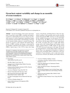 Accurate knowledge of the location and magnitude of ocean heat content (OHC) variability and change is essential for understanding the processes that govern decadal variations in surface temperature, quantifying changes in the planetary energy budget, and developing constraints on the transient climate response to external forcings. We present an overview of the temporal and spatial characteristics of OHC variability and change as represented by an ensemble of dynamical and statistical ocean reanalyses (ORAs). Spatial maps of the 0–300 m layer show large regions of the Pacific and Indian Oceans where the interannual variability of the ensemble mean exceeds ensemble spread, indicating that OHC variations are well-constrained by the available observations over the period 1993–2009. At deeper levels, the ORAs are less well-constrained by observations with the largest differences across the ensemble mostly associated with areas of high eddy kinetic energy, such as the Southern Ocean and boundary current regions. Spatial patterns of OHC change for the period 1997–2009 show good agreement in the upper 300 m and are characterized by a strong dipole pattern in the Pacific Ocean. There is less agreement in the patterns of change at deeper levels, potentially linked to differences in the representation of ocean dynamics, such as water mass formation processes. However, the Atlantic and Southern Oceans are regions in which many ORAs show widespread warming below 700 m over the period 1997–2009. Annual time series of global and hemispheric OHC change for 0–700 m show the largest spread for the data sparse Southern Hemisphere and a number of ORAs seem to be subject to large initialization ‘shock’ over the first few years. In agreement with previous studies, a number of ORAs exhibit enhanced ocean heat uptake below 300 and 700 m during the mid-1990s or early 2000s. The ORA ensemble mean (±1 standard deviation) of rolling 5-year trends in full-depth OHC shows a relatively steady heat uptake of approximately 0.9 ± 0.8 W m−2 (expressed relative to Earth’s surface area) between 1995 and 2002, which reduces to about 0.2 ± 0.6 W m−2 between 2004 and 2006, in qualitative agreement with recent analysis of Earth’s energy imbalance. There is a marked reduction in the ensemble spread of OHC trends below 300 m as the Argo profiling float observations become available in the early 2000s. In general, we suggest that ORAs should be treated with caution when employed to understand past ocean warming trends—especially when considering the deeper ocean where there is little in the way of observational constraints. The current work emphasizes the need to better observe the deep ocean, both for providing observational constraints for future ocean state estimation efforts and also to develop improved models and data assimilation methods.