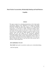 This paper examines two contrasting interpretations of how bank market concentration (Market Power Hypothesis) and banking relationships (Information Hypothesis) affect three sources of small firm liquidity (cash, lines of credit and trade credit). Supportive of a market power interpretation, we find that in a highly concentrated banking market, small firms hold less cash, have less access to lines of credit, and are more likely to be financially constrained, use greater amounts of more expensive trade credit and face higher penalties for trade credit late payment. We also find support for the information hypothesis: relationship banking improves small business liquidity, particularly in a concentrated banking market, thereby mitigating the adverse effects of bank market concentration derived from market power. Our results are robust to different cash, lines of credit and trade credit measures and to alternative empirical approaches.