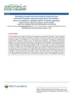 Binder, C. R., Garcia-Santos, G., Andreoli, R., Diaz, J., Feola, G., Wittensoeldner, M. and Yang, J. (2016) Simulating human and environmental exposure from hand-held knapsack pesticide application: Be-WetSpa-Pest, an integrative, spatially explicit modeling approach. Journal of Agricultural and Food Chemistry, 64 (20). pp. 3999-4008. ISSN 0021-8561 doi: 10.1021/acs.jafc.5b05304