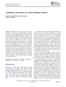 Anticipation is increasingly central to urgent contemporary debates, from climate change to the global economic crisis. Anticipatory practices are coming to the forefront of political, organizational, and citizens’ society. Research into anticipation, however, has not kept pace with public demand for insights into anticipatory practices, their risks and uses. Where research exists, it is deeply fragmented. This paper seeks to identify how anticipation is defined and understood in the literature and to explore the role of anticipatory practice to address individual, social, and global challenges. We use a resilience lens to examine these questions. We illustrate how varying forms of anticipatory governance are enhanced by multi-scale regional networks and technologies and by the agency of individuals, drawing from an empirical case study on regional water governance of Mälaren, Sweden. Finally, we discuss how an anticipatory approach can inform adaptive institutions, decision making, strategy formation, and societal resilience.