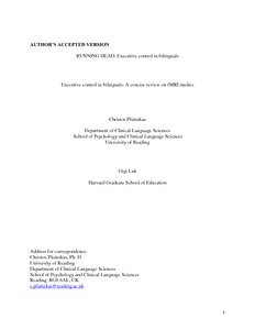 Pliatsikas, C. ORCID: https://orcid.org/0000-0001-7093-1773 and Luk, G. (2016) Executive control in bilinguals: a concise review on fMRI studies. Bilingualism: Language and Cognition, 19 (4). pp. 699-705. ISSN 1469-1841 doi: 10.1017/S1366728916000249