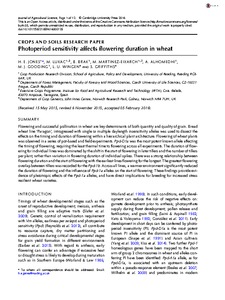 Flowering and successful pollination in wheat are key determinants of both quantity and quality of grain. Bread wheat line ‘Paragon’, introgressed with single or multiple day length insensitivity alleles was used to dissect the effects on the timing and duration of flowering within a hierarchical plant architecture. Flowering of wheat plants was observed in a series of pot-based and field experiments. Ppd-D1a was the most potent known allele affecting the timing of flowering, requiring the least thermal time to flowering across all experiments. The duration of flowering for individual lines was dominated by the shift in the start of flowering in later tillers and the number of tillers per plant, rather than variation in flowering duration of individual spikes. There was a strong relationship between flowering duration and the start of flowering with the earliest lines flowering for the longest. The greatest flowering overlap between tillers was recorded for the Ppd-1b. Across all lines, a warmer environment significantly reduced the duration of flowering and the influence of Ppd-1a alleles on the start of flowering. These findings provide evidence of pleiotropic effects of the Ppd-1a alleles, and have direct implications for breeding for increased stress resilient wheat varieties.