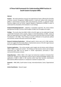 Purpose We study particular structural and organisational factors affecting the formality of human resource management (HRM) practices in small and medium-sized enterprises (SMEs) in South-Eastern European (SEE) post-communist countries, in particular Serbia, Romania, Bulgaria and the Former Yugoslav Republic of Macedonia (FYROM) in order to understand the antecedents of formalization in such settings. Design/methodology/approach Adopting a quantitative approach, this study analyses data gathered through a survey of 168 managers of SMEs from throughout the region. Findings The results show that HRM in SMEs in the SEE region can be understood through a three-fold framework which includes: degree of internationalisation of SMEs, sector of SMEs and organisational size of SMEs. These three factors positively affect the level of HRM formalisation in SEE SMEs. These findings are further attributed to the particular political and economic context of the post-communist SEE region. Research limitations/implications Although specific criteria were set for SME selection, we do not suggest that the study reflects a representative picture of the SEE region because we used a purposive sampling methodology. Practical implications This article provides useful insights into the factors which influence HRM in SMEs in a particular context. The findings can help business owners and managers understand how HRM can be applied in smaller organisations, particularly in post-communist SEE business contexts. Originality/value HRM in SMEs in this region has hardly been studied at all despite their importance. Therefore, this exploratory research seeks to expand knowledge relating to the application of HRM in SMEs in SEE countries which have their business environments dominated by different dynamics in comparison to western European ones.