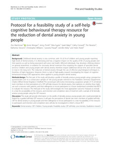 Marshman, Z., Morgan, A., Porritt, J., Gupta, E., Baker, S., Creswell, C., Newton, T., Stevens, K., Williams, C., Prasad, S., Kirby, J. and Rodd, H. (2016) Protocol for a feasibility study of a self help cognitive behavioural therapy resource for the reduction of dental anxiety in young people. Pilot and feasibility studies, 2 (1). 13. ISSN 2055-5784 doi: 10.1186/s40814-016-0054-2