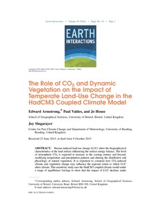 Armstrong, E., Valdes, P., House, J. and Singarayer, J. S. (2016) The role of CO2 and dynamic vegetation on the impact of temperate land use change in the HadCM3 coupled climate model. Earth Interactions, 20 (10). pp. 1-20. ISSN 1087-3562 doi: 10.1175/EI-D-15-0036.1