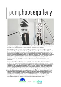 Progress Report from the Strategic Sanctuary for the Destruction of Free Will presents a new work combining film, music and installation that juxtaposes the setting of the institution with the aesthetics of psychedelia.Progress Report from the Strategic Sanctuary for the Destruction of Free Will is an installation, film and sound work that takes over the gallery. Using plain white card, it distorts the structure of the gallery’s architecture, producing a paranoid shrunken space. Inside this space, performers in cardboard costumes re-enact abstracted, broken gestures drawn from video documentation of acid trips, psychedelic dancing, rehab sessions and radical psychotherapy workshops. Progress Report from the Strategic Sanctuary for the Destruction of Free Will has been formed through Pil and Galia Kollectiv’s research into the anti-psychiatry movement, their interests in counter cultural movements and their studies around biopolitics and the proliferation of societal medication. In 1958, having had a life changing experience with LSD, former alcoholic Charles Dederich founded Synanon, a drug rehabilitation program based on residential care and an aggressive form of group therapy called ‘The Game’. The organisation gradually evolved into a controversial alternative community, described in a critical pamphlet as creating Strategic Sanctuaries for the Destruction of Free Will, “a subversive program for mixing delinquents and lefties”. In 1984, anti-psychiatrist R. D. Laing described tranquillizers as chemical straight jackets. With our growing understanding of the plasticity of the brain and the potential to shape it, the tension between liberation and control in the struggle over the mind continues to define our relationship to labour, culture and production. Interrogating these ideas, the exhibition poses the question of whether a collective body can overcome the solipsism of the incommunicable experience of the individual mind.