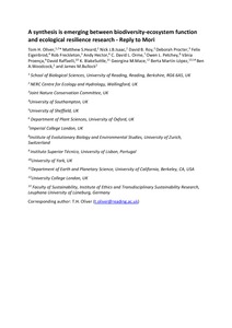 Oliver, T. H. ORCID: https://orcid.org/0000-0002-4169-7313, Heard, M. S., Isaac, N. J.B., Roy, D. B., Procter, D., Eigenbrod, F., Freckleton, R., Hector, A., Orme, C. D. L., Petchey, O. L., Proença, V., Raffaelli, D., Blake Suttle, K., Mace, G. M., Martín-López, B., Woodcock, B. A. and Bullock, J. M. (2016) A synthesis is emerging between biodiversity–ecosystem function and ecological resilience research: reply to Mori. Trends in Ecology & Evolution, 31 (2). pp. 89-92. ISSN 0169-5347 doi: 10.1016/j.tree.2015.12.008