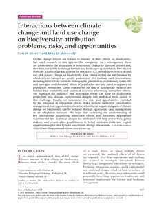 Global change drivers are known to interact in their effects on biodiversity, but much research to date ignores this complexity. As a consequence, there are problems in the attribution of biodiversity change to different drivers and, therefore, our ability to manage habitats and landscapes appropriately. Few studies explicitly acknowledge and account for interactive (i.e., nonadditive) effects of land use and climate change on biodiversity. One reason is that the mechanisms by which drivers interact are poorly understood. We evaluate such mechanisms, including interactions between demographic parameters, evolutionary trade-offs and synergies and threshold effects of population size and patch occupancy on population persistence. Other reasons for the lack of appropriate research are limited data availability and analytical issues in addressing interaction effects. We highlight the influence that attribution errors can have on biodiversity projections and discuss experimental designs and analytical tools suited to this challenge. Finally, we summarize the risks and opportunities provided by the existence of interaction effects. Risks include ineffective conservation management; but opportunities also arise, whereby the negative impacts of climate change on biodiversity can be reduced through appropriate land management as an adaptation measure. We hope that increasing the understanding of key mechanisms underlying interaction effects and discussing appropriate experimental and analytical designs for attribution will help researchers, policy makers, and conservation practitioners to better minimize risks and exploit opportunities provided by land use-climate change interactions.