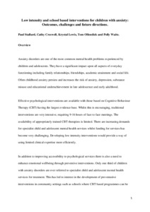 Low intensity and school based interventions for children with anxiety: outcomes, challenges and future directions.
