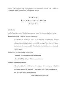 Traditional approaches to the way people react to food risks often focus on ways in which the media distort information about risk, or on the deficiencies in people’s interpretation of this information. In this chapter Jones offers an alternative model which sees decisions regarding food risk as taking place at a complex nexus where different people, texts, objects and practices, each with their own histories, come together. Based on a case study of a food scandal involving a particular brand of Chinese candy, Jones argues that understanding why people respond the way they do to food risk requires tracing the itineraries along which different people, texts, objects and practices have traveled to converge at particular moments, and understanding the kinds of concrete social actions that these convergences make possible.