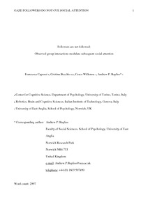 Dalmaso, M., Edwards, S. G., & Bayliss, A. P. (2015). Re-Encountering individuals who previously engaged in joint gaze modulates subsequent gaze cueing. Journal of Experimental Psychology : Learning, Memory, and Cognition. http://doi.org/http://dx.doi.org/10.1037/xlm0000159