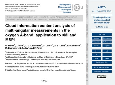 Merlin, G., Riedi, J., Labonnote, L. C., Cornet, C., Davis, A. B., Dubuisson, P., Desmons, M., Ferlay, N. and Parol, F. (2015) Cloud information content analysis of multi-angular measurements in the oxygen A-band: application to 3MI and MSPI. Atmospheric Measurement Techniques Discussions, 8 (12). pp. 12709-12758. ISSN 1867-8610 doi: 10.5194/amtd-8-12709-2015