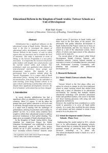School reform is a major concern in many countries that seek to improve their educational systems and enhance their performances. In consequence, many global schemes, theories, studies, attempts, and programmes have been introduced to promote education in recent years. Saudi Arabia is one of these countries that implemented educational change by introducing many initiatives. The Tatweer Programme is one of these initiatives and is considered as a major recent reform. The main purpose of this study is to investigate this reform in depth by examining the perceptions and experiences of the Tatweer leaders and teachers to find out which extent they have been enabled to be innovative, and to examine the types of leadership and decision-making that have been undertaken by such schools. This study adopted a qualitative case study that employed interviews, focus groups and documentary analysis. The design of the study has been divided into two phases; the first phase was the feasibility study and the second phase was the main study. The research sample of the feasibility study was head teachers, educational experts and Tatweer Unit’s members. The sample of the main study was three Tatweer schools, Tatweer Unit members and one official of Tatweer Project in Riyadh. The findings of this study identified the level of autonomy in managing the school; the Tatweer schools’ system is semi-autonomous when it comes to the internal management, but it lacks autonomy when it comes to staff appointment, student assessment, and curriculum development. In addition, the managerial work has been distributed through teams and members; the Excellence Team plays a critical role in school effectiveness leading an efficient change. Moreover, Professional Learning Communities have been used to enhance the work within Tatweer schools. Finally the findings show that there have been major shifts in the Tatweer schools’ system; the shifting from centralisation to semi-decentralisation; from the culture of the individual to the culture of community; from the traditional school to one focused on self-evaluation and planning; from management to leadership; and from an isolated school being open to society. These shifts have impacted positively on the attitudes of students, parents and staff.