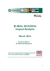 During the summer and autumn of 2015, El Niño conditions in the east and central Pacific strengthened, disrupting weather patterns throughout the tropics and into the mid-latitudes. For example, rainfall during the summer’s Indian monsoon was approximately 15% below normal. The continued strong El Niño conditions have the potential to trigger damaging impacts (e.g., droughts, famines, floods), particularly in less-developed tropical countries, which would require a swift and effective humanitarian response to mitigate damage to life and property (e.g., health, migration, infrastructure). This analysis uses key climatic variables (temperature, soil moisture and precipitation) as measures to monitor the ongoing risk of these potentially damaging impacts. The previous 2015-2016 El Niño Impact Analysis was based on observations over the past 35 years and produced Impact Tables showing the likelihood and severity of the impacts on temperature and rainfall by season. The current report is an extension of this work, providing information from observations and seasonal forecast models to give a more detailed outlook of the potential near-term impacts of the current El Niño conditions by region. This information has been added to the Impact Tables in the form of an ‘Observations and Outlook’ row. This consists of observational information for the past seasons of JJA 2015, SON 2015 and DJF 2015/2016, a detailed monthly outlook from 5 modeling centres for Mar 2016 and then longer-term seasonal forecast information from 2 modeling centres for the future seasons of AM 2016 and JJA 2016. The seasonal outlook information is an indication of the average likely conditions for that coming month (or season) and region and is not a definite prediction of weather impacts. This report has been produced by University of Reading for Evidence on Demand with the assistance of the UK Department for International Development (DFID) contracted through the Climate, Environment, Infrastructure and Livelihoods Professional Evidence and Applied Knowledge Services (CEIL PEAKS) programme, jointly managed by DAI (which incorporates HTSPE Limited) and IMC Worldwide Limited.