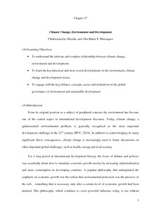 Climate change, a quintessential environmental problem, is generally recognised as the most important development challenge in the 21st century (IPCC, 2014). In addition to acknowledging its many significant direct consequences, climate change is increasingly used to frame discussions on other important global challenges, such as health, energy and food security. This chapter provides understanding of the intricate and complex relationship between climate change, environment and development.