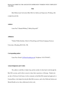Pass, L., Whitney, H. and Reynolds, S. (2016) Brief behavioural activation for adolescent depression: working with complexity and risk. Clinical Case Studies, 15 (5). pp. 360-375. ISSN 1552-3802 doi: 10.1177/1534650116645402