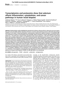 Meplan, C., Johnson, I. T., Polley, A. C. J., Cockell, S., Bradburn, D. M., Commane, D. M., Arasaradnam, R. P., Mulholland, F., Zupanic, A., Mathers, J. C. and Hesketh, J. (2016) Transcriptomics and proteomics show that selenium affects inflammation, ctoskeleton, and cancer pathways in human rectal biopsies. The FASEB Journal, 30 (8). pp. 2812-2825. ISSN 1530-6860 doi: 10.1096/fj.201600251R