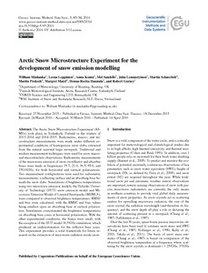 Maslanka, W. ORCID: https://orcid.org/0000-0002-1777-733X, Leppanen, L., Kontu, A., Sandells, M., Lemmetyinen, J., Schneebeli, M., Proksch, M., Matzl, M., Hannula, H.-R. and Gurney, R. (2016) Arctic Snow Microstructure Experiment for the development of snow emission modelling. Geoscientific Instumentation, Methods and Data Systems, 5 (1). pp. 85-94. ISSN 2193-0864 doi: 10.5194/gi-5-85-2016