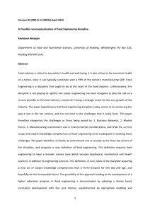 Food industry is critical to any nation’s health and well-being; it is also critical to the economic health of a nation, since it can typically constitute over a fifth of the nation’s manufacturing GDP. Food Engineering is a discipline that ought to be at the heart of the food industry. Unfortunately, this discipline is not playing its rightful role today: engineering has been relegated to play the role of a service provider to the food industry, instead of it being a strategic driver for the very growth of the industry. This paper hypothesises that food engineering discipline, today, seems to be continuing the way it was in the last century, and has not risen to the challenges that it really faces. This paper therefore categorises the challenges as those being posed by: 1. Business dynamics, 2. Market forces, 3. Manufacturing environment and 4. Environmental Considerations, and finds the current scope and subject-knowledge competencies of food engineering to be inadequate in meeting these challenges. The paper identifies: a) health, b) environment and c) security as the three key drivers of the discipline, and proposes a new definition of food engineering. This definition requires food engineering to have a broader science base which includes biophysical, biochemical and health sciences, in addition to engineering sciences. This definition, in turn, leads to the discipline acquiring a new set of subject-knowledge competencies that is fit-for-purpose for this day and age, and hopefully for the foreseeable future. The possibility of this approach leading to the development of a higher education program in food engineering is demonstrated by adopting a theme based curriculum development with five core themes, supplemented by appropriate enabling and knowledge integrating courses. At the heart of this theme based approach is an attempt to combine engineering of process and product in a purposeful way, termed here as Food Product Realisation Engineering. Finally, the paper also recommends future development of two possible niche specialisation programs in Nutrition and Functional Food Engineering and Gastronomic Engineering. It is hoped that this reconceptualization of the discipline will not only make it more purposeful for the food industry, but it will also make the subject more intellectually challenging and attract bright young minds to the discipline.